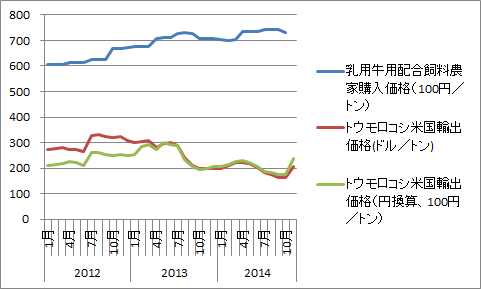 「我慢の限度を超えている」という叫びも無理もない。この3年、例えば乳牛飼育用配合飼料農家購入価格(農水省調べ)は、2012年秋以降のトウモロコシ国際価格の下落傾向にもかかわらず、ほとんど上がりっぱなしだ。2013年半ばからの国際価格の下落は、やや遅れて配合飼料農家購入価格に多少反映された。それもつかの間、今年4月には国際価格の僅かばかりの上昇と消費税増税、円安の進行を反映して急騰する。国際価格は5、6月頃から下落に転じたが、それが購入価格に僅かに反映されるのは10月になってからである。その矢先、今度は国際価格の少々の上昇と円安の急進で、購入価格は間違いなく急騰することになるだろう(下図)。主犯は間違いなくアベノミクスだ。酪農家がバタバタ倒れるのもそのせいだ。