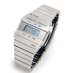 LCDのまわりがミラーになっており、さらにLCD自体も地に細かいメッシュ状の独特な表情があります。ステンレス無垢のケースやブレスの重厚感に加え、表面の表記も彫り文字に黒い色差しがなされる等、非常に手の込んだ作りをしています。
