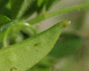 切り取って 5日目(2007.4.17) 果実の長さ 2.3cm 果実が大きくなってきました。 先端に花のしぼんだ跡が 残っています。 (萼が黒いのはマークです) |