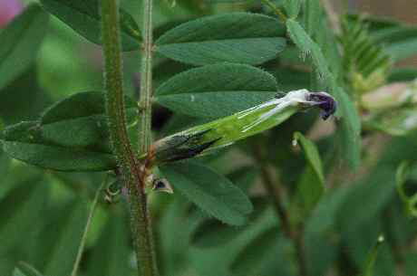 切り取って 32日目(2007.5.14) 果実の長さ 4.0cm 果実はカラスのように 真っ黒になりました。 (カラスノエンドウの名前は ここから来ているそうです) |