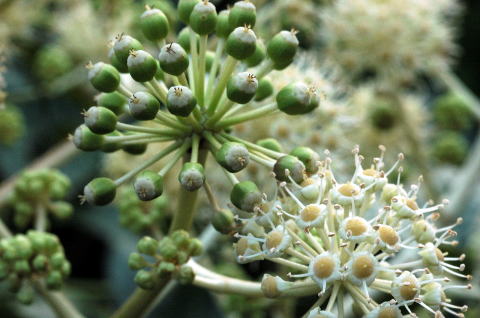 ヤツデの花は、雌花(上)と雄花(下)とが